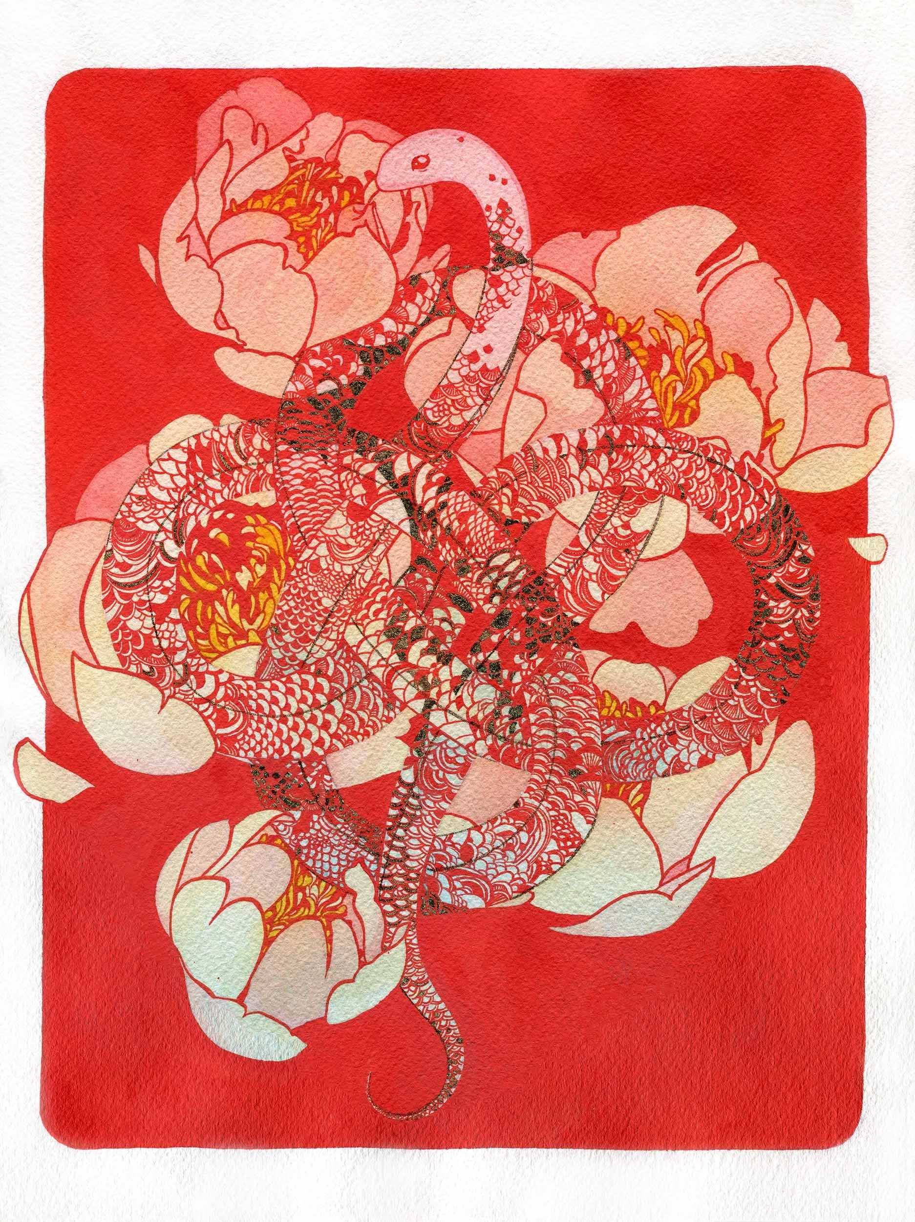 Button Snake | detail | watercolor and acrylic on paper | 9x12" •